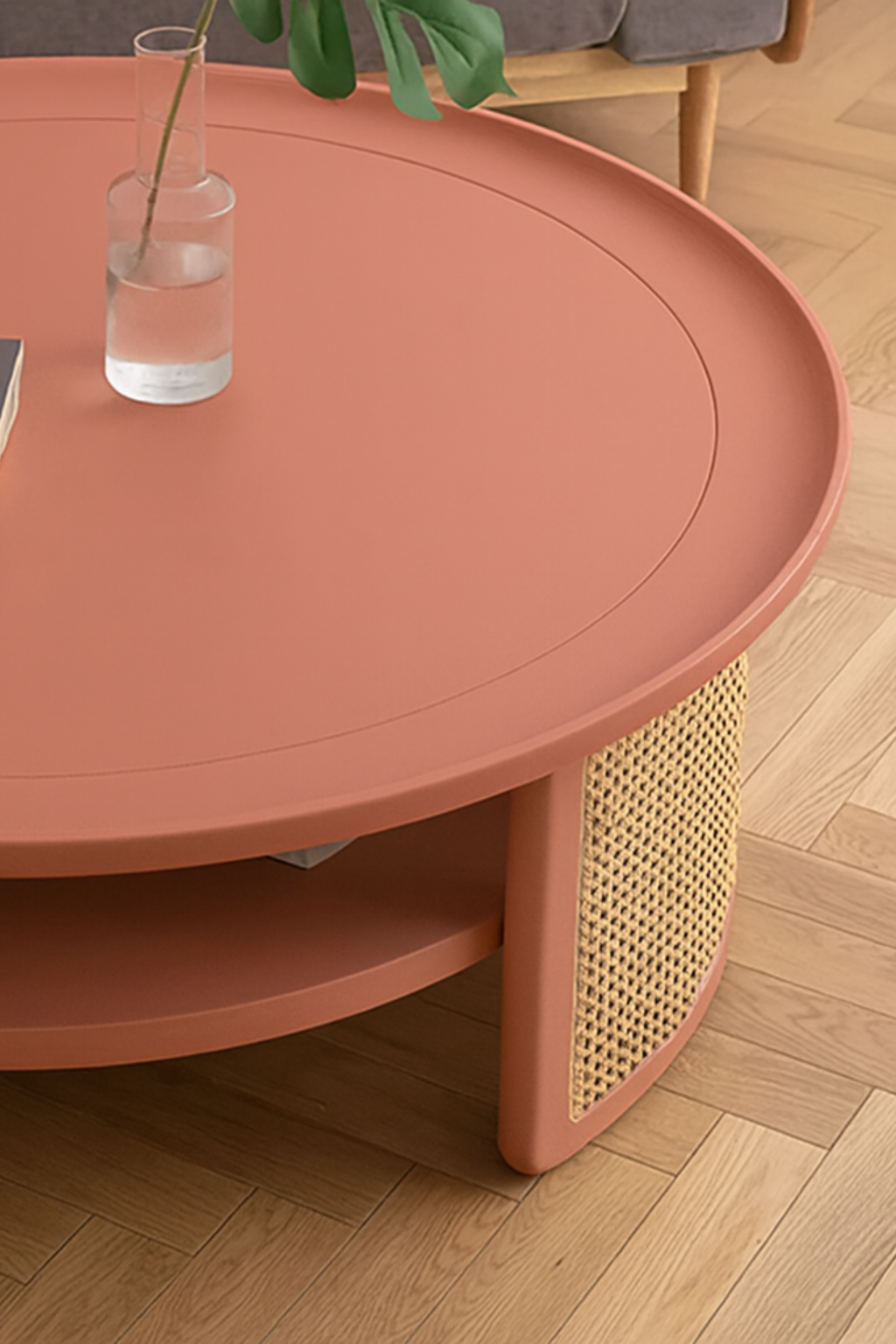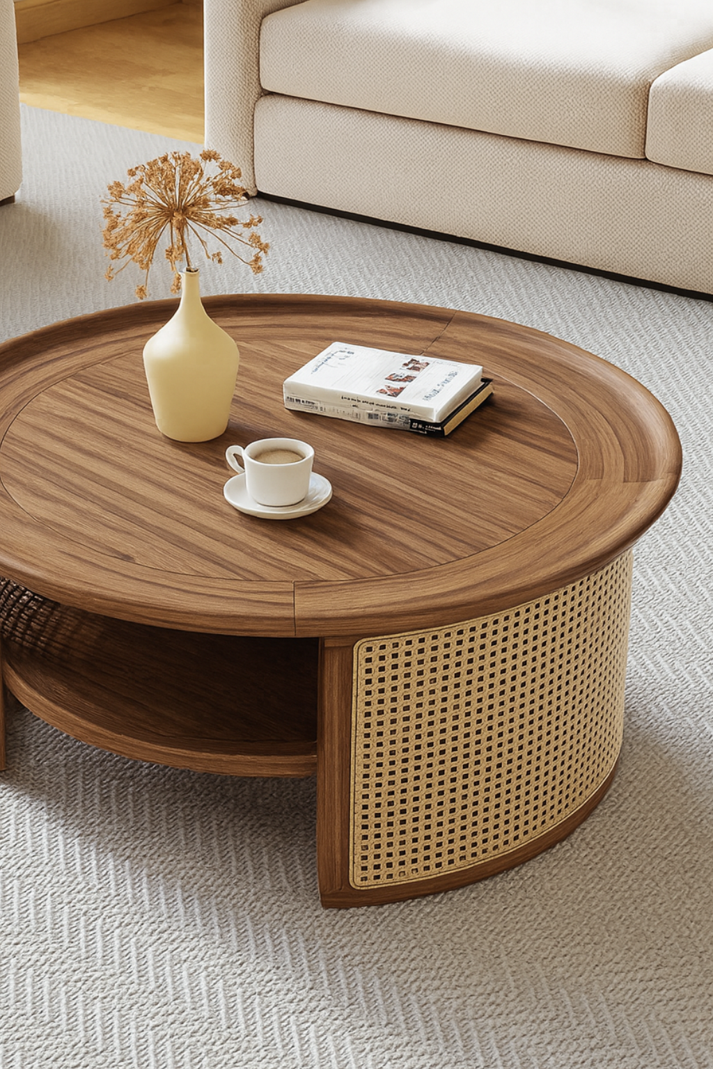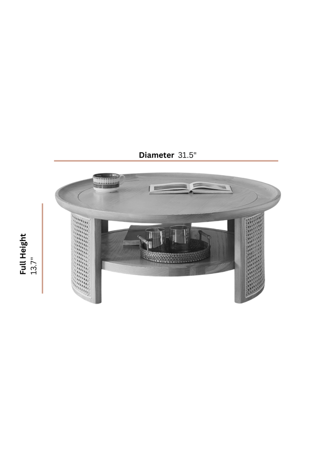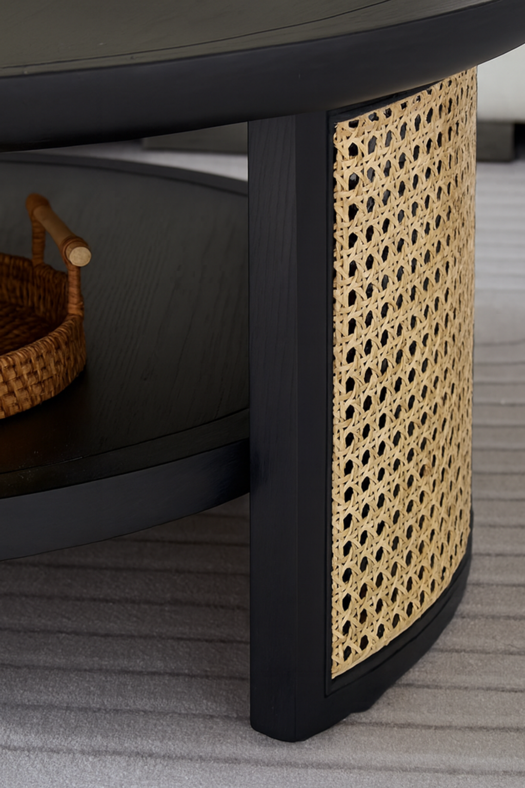 The Bagya Coffee Table showcases a two-level circular design crafted from durable rattan, combining natural texture with modern elegance. Its tray-like top offers a versatile surface for serving or display, while the lower level provides additional storage space, making it both functional and stylish for contemporary living spaces.