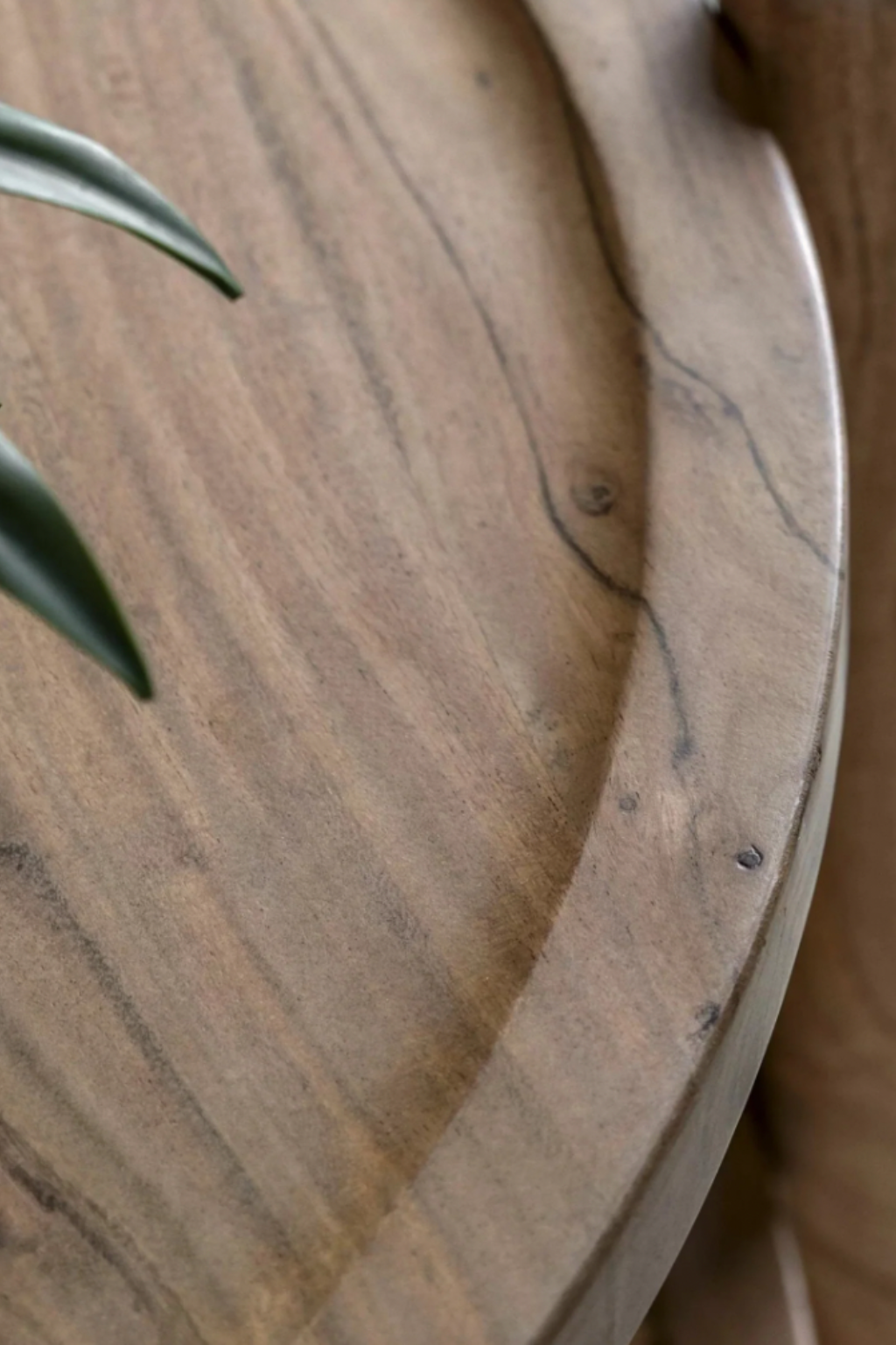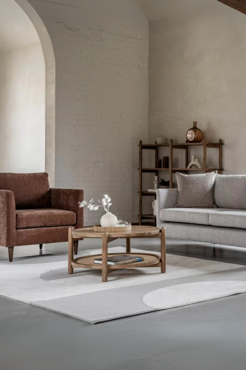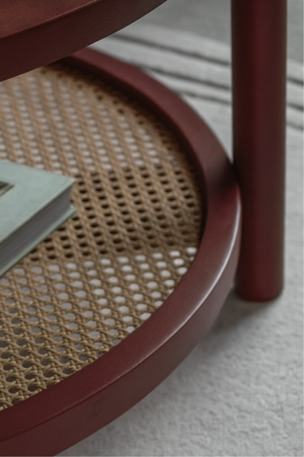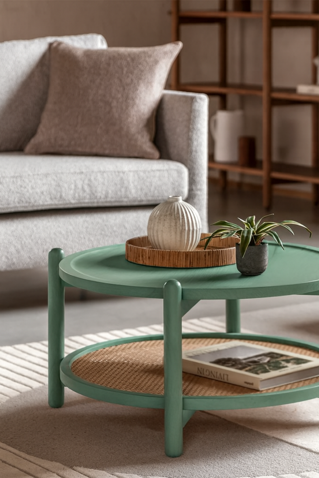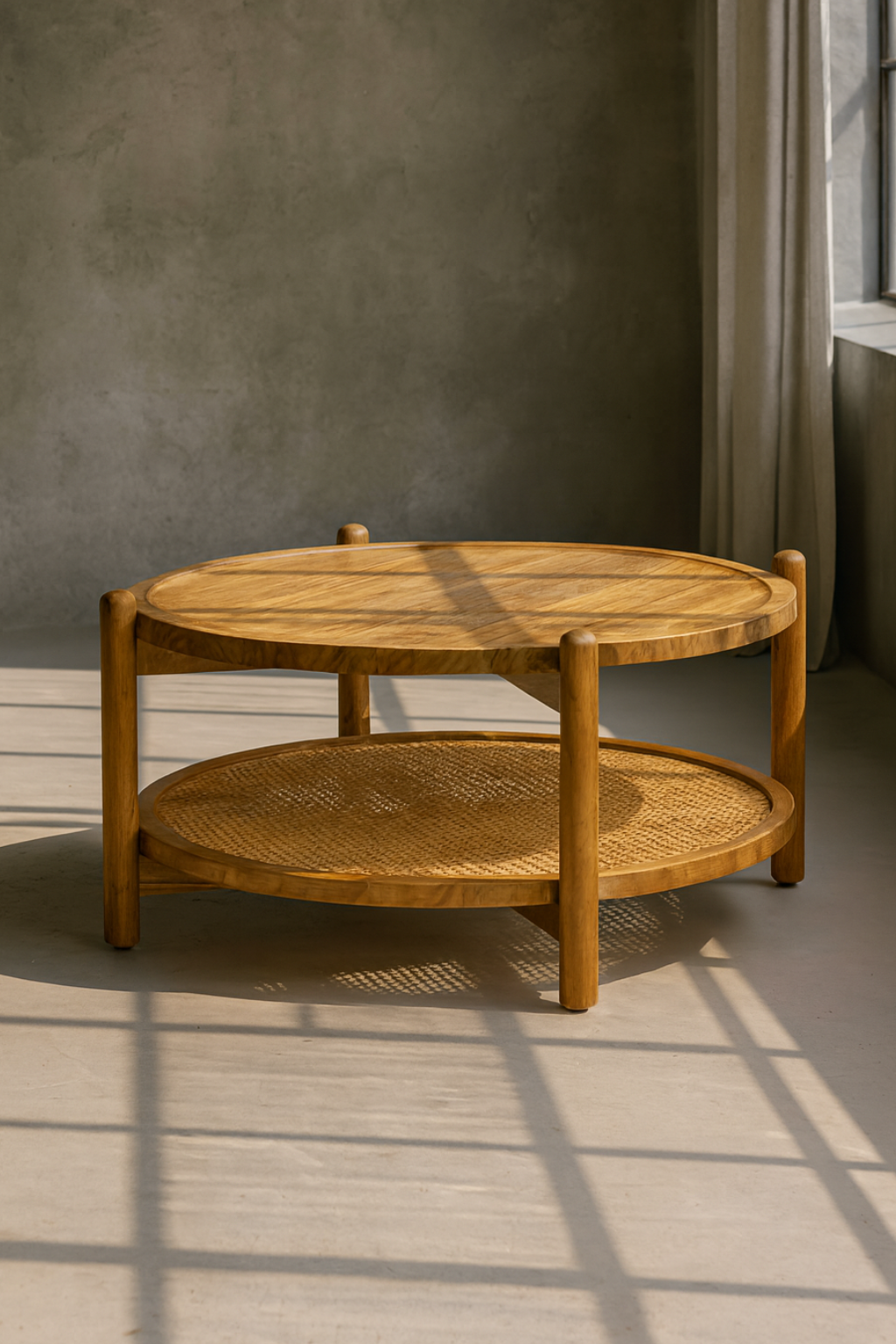 The Rajgarh Coffee Table combines a sturdy rattan base with a wooden circular top, showcasing a modern design that blends natural materials with contemporary style. Its durable construction ensures lasting use, while the smooth wooden surface provides an elegant focal point for your living space.
