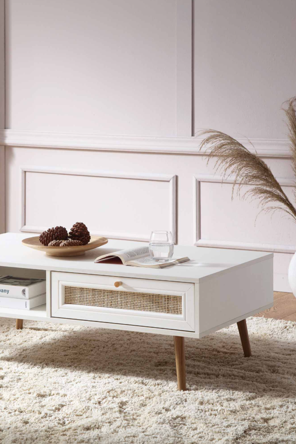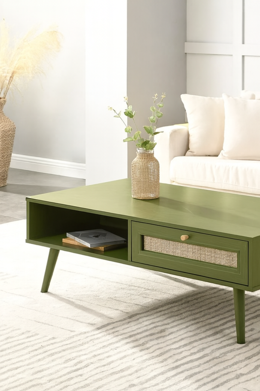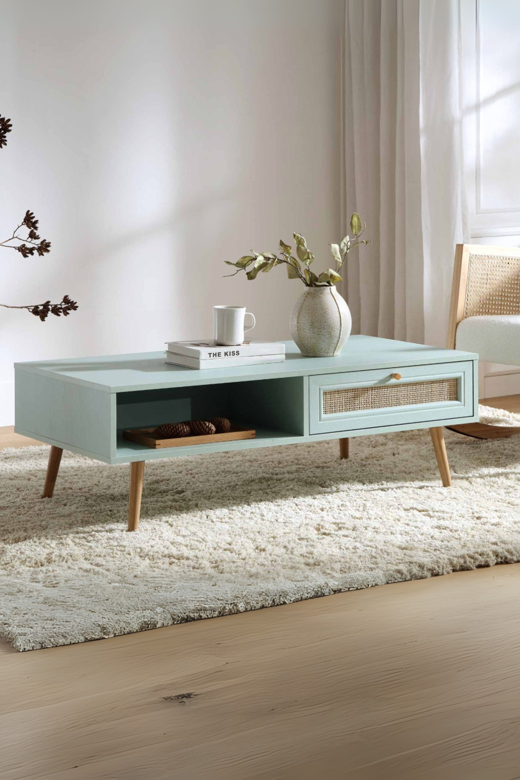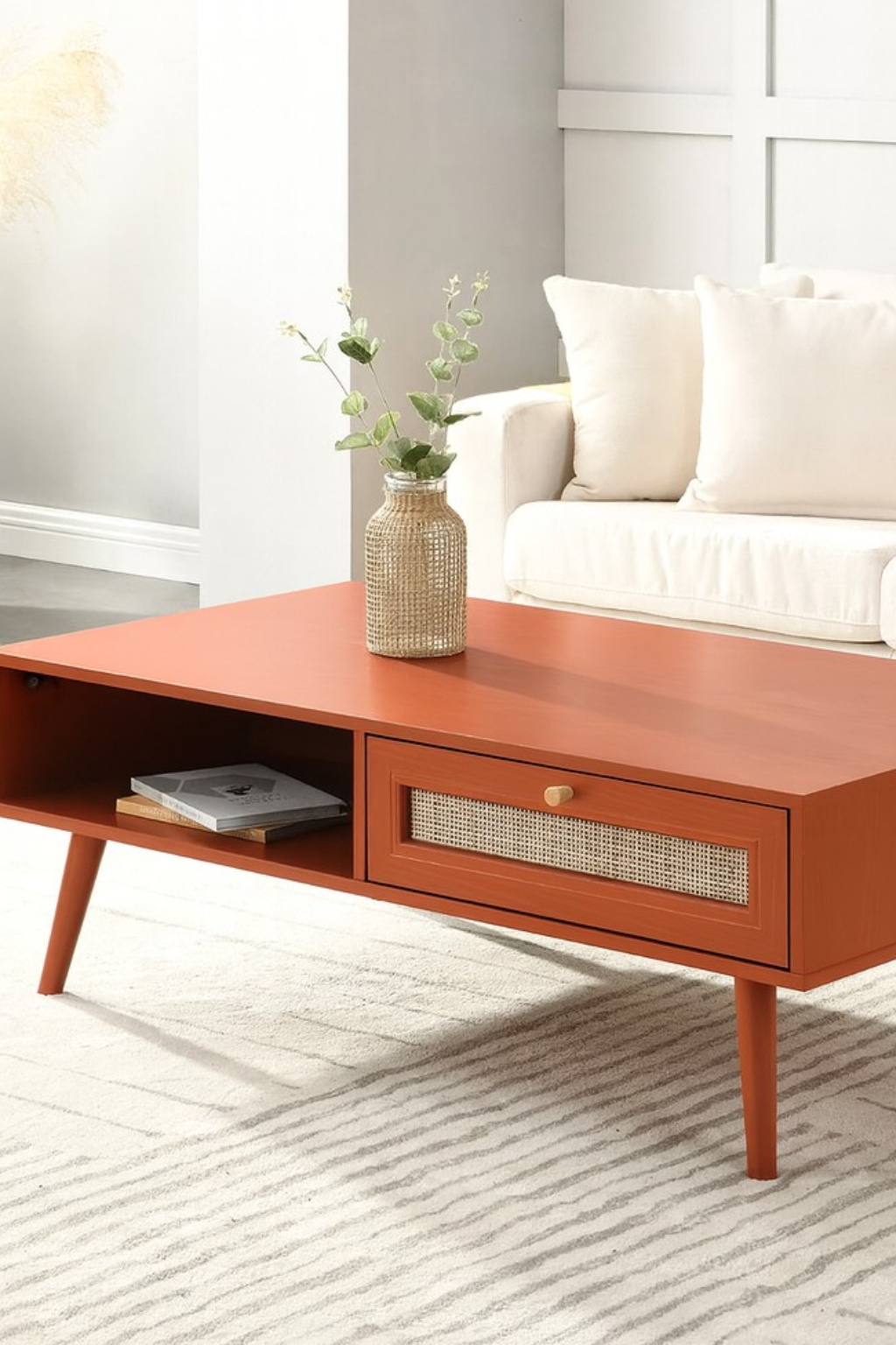 The Puranik Coffee Table features a solid wood top paired with a sturdy rattan base, offering a robust and stylish centerpiece for any living area. Its durable construction ensures stability and long-lasting use, while the natural materials create a warm, inviting atmosphere.
