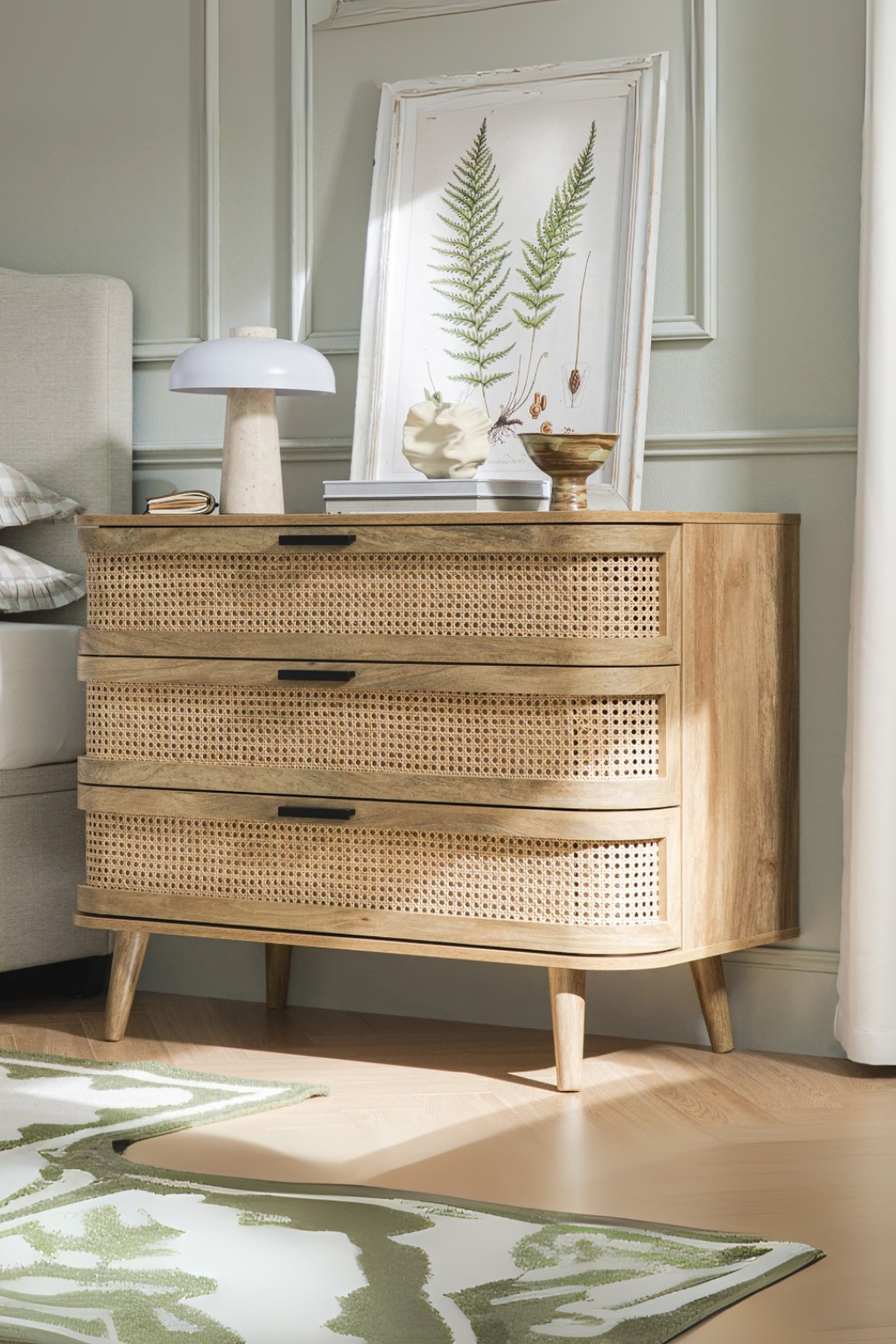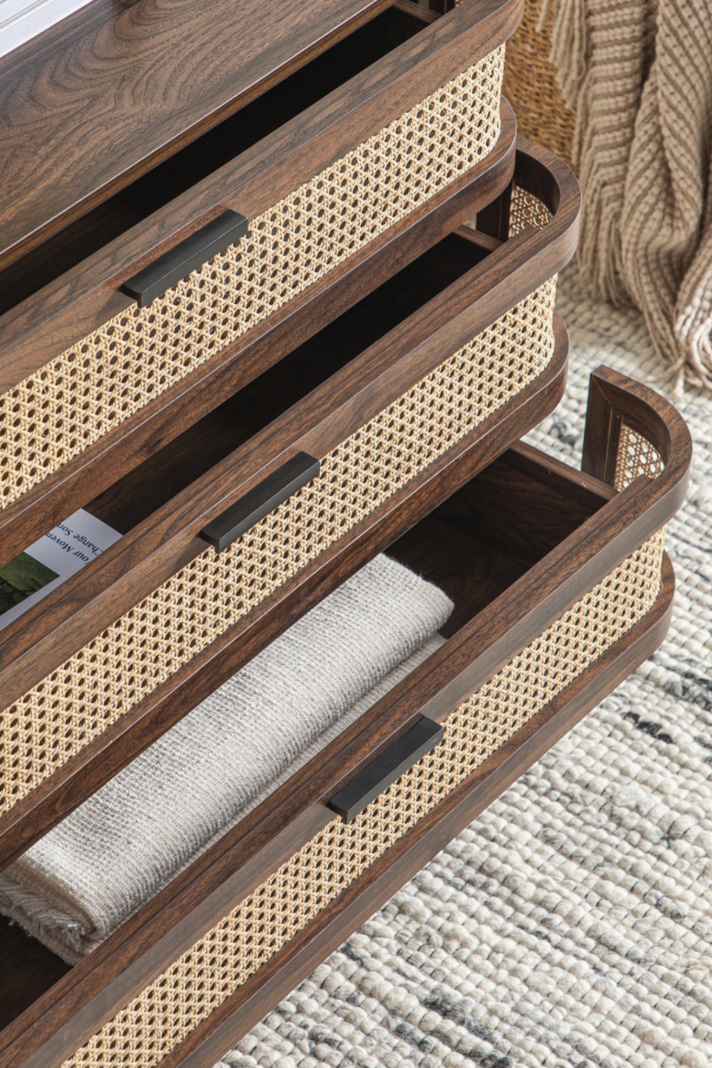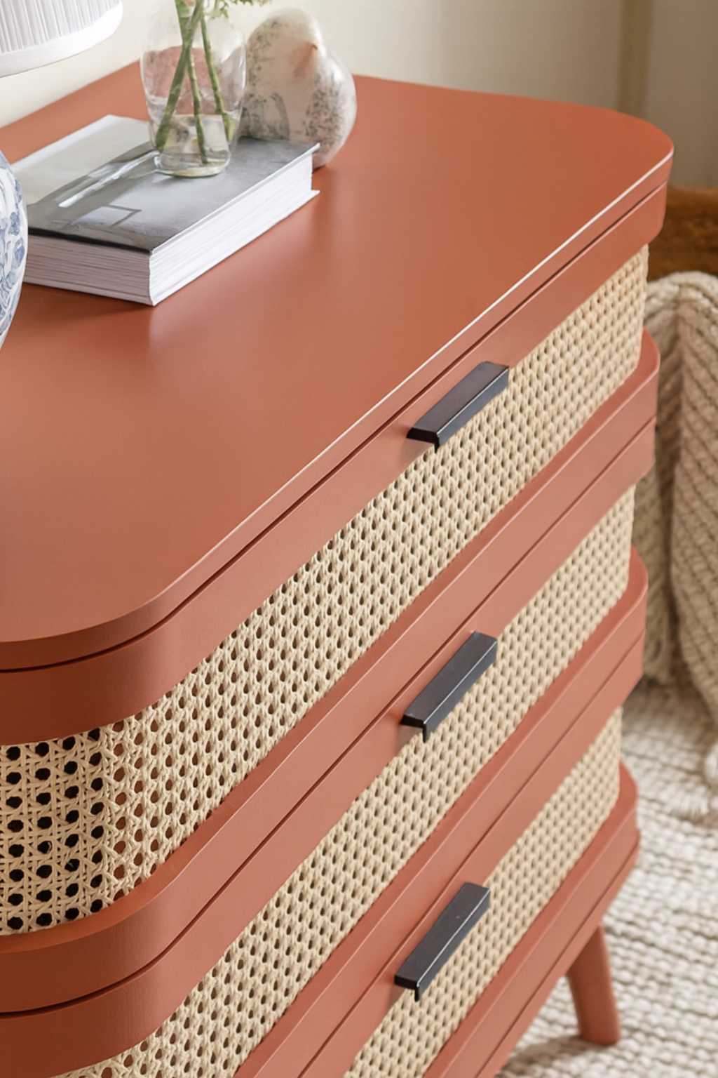 The Ranchi 3 Drawer Chest combines elegant curved wood craftsmanship with a refined rattan design, offering both style and practicality. Equipped with durable Hettich mechanisms, the drawers ensure smooth and reliable operation. This piece adds timeless sophistication to any room while providing organized storage with ease and longevity.