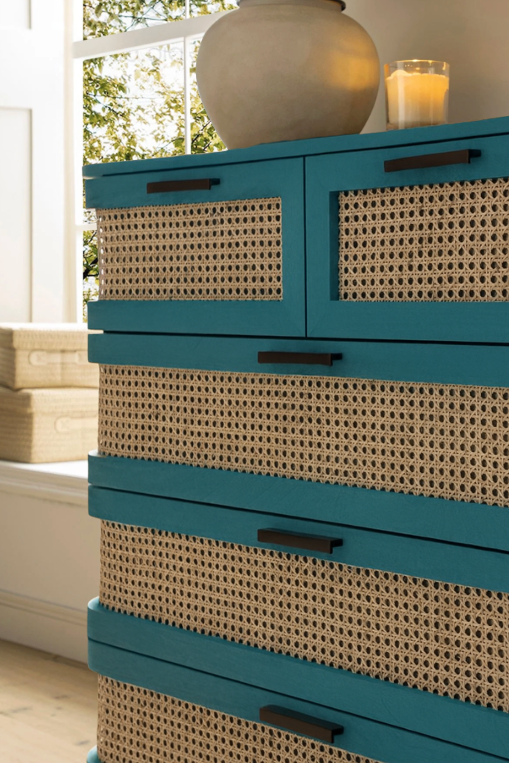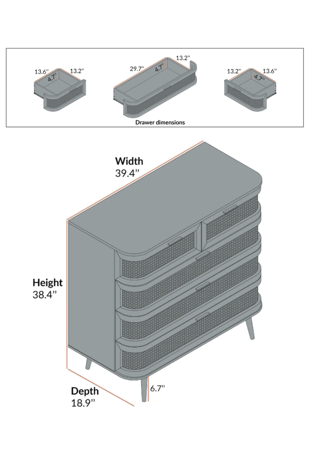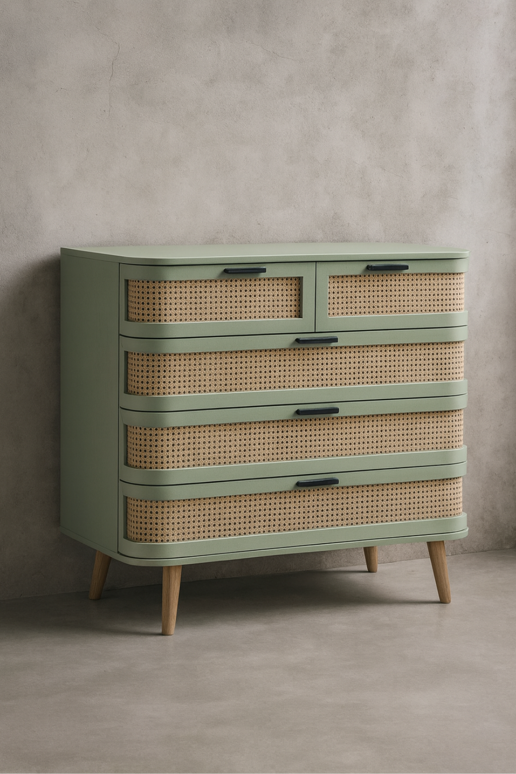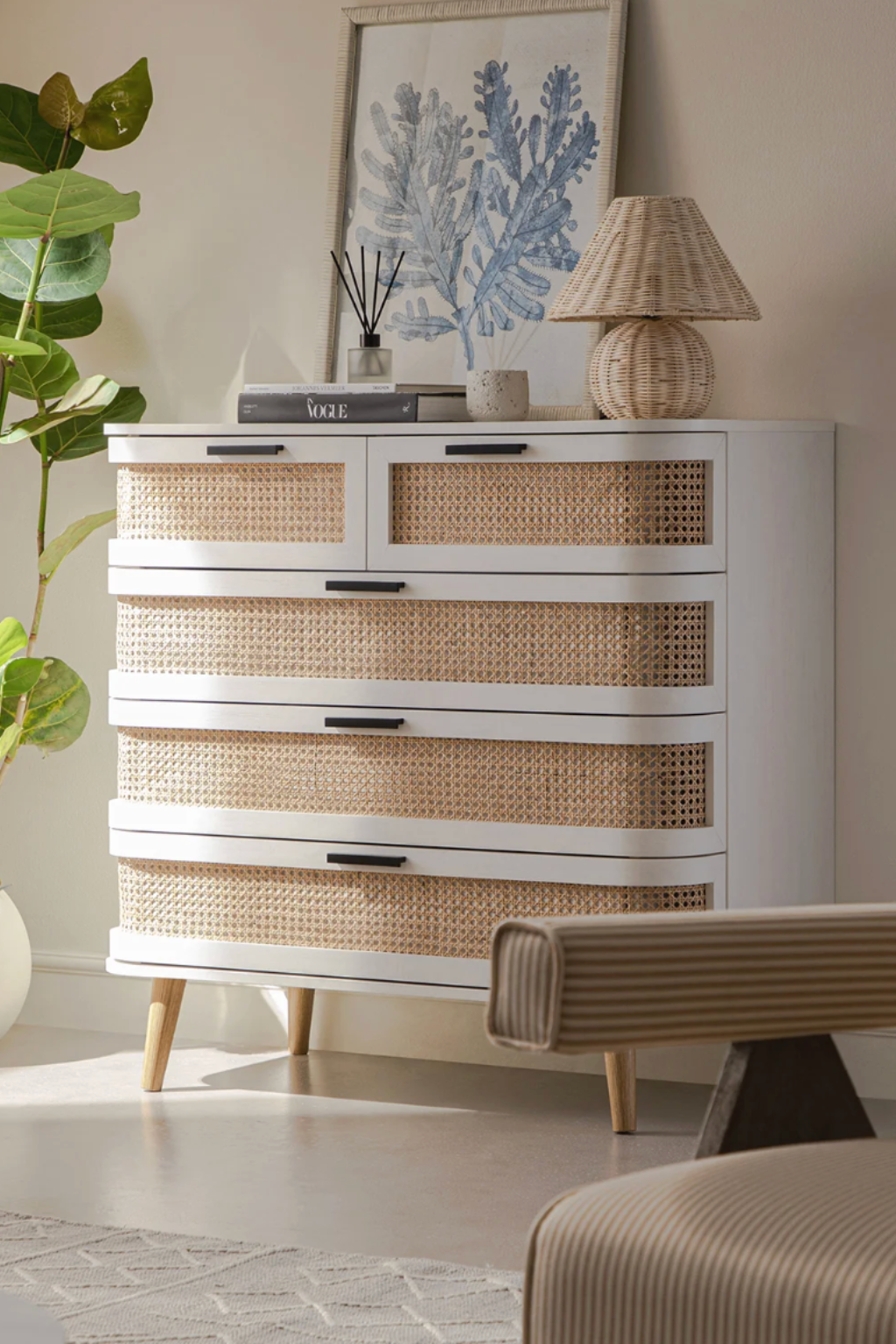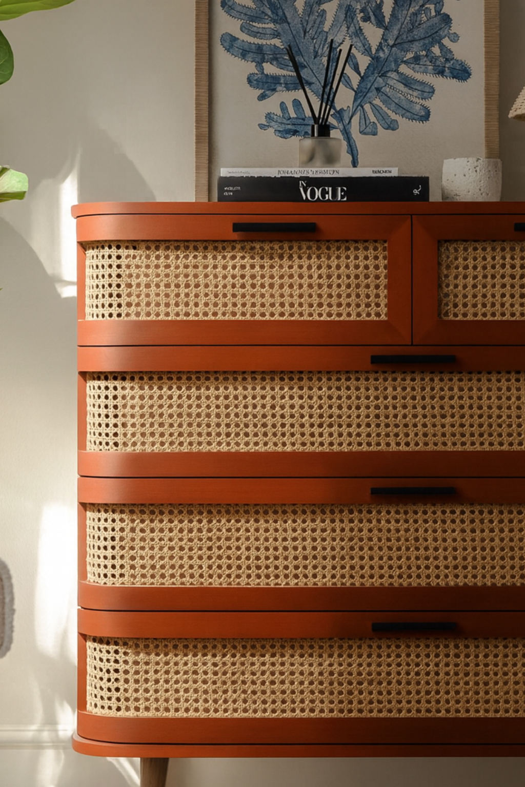The Ranchi 5 Drawer Chest combines elegant curved wood craftsmanship with a refined rattan design, offering both style and practicality. Equipped with durable Hettich mechanisms, the drawers ensure smooth and reliable operation. This piece adds timeless sophistication to any room while providing organized storage with ease and longevity.