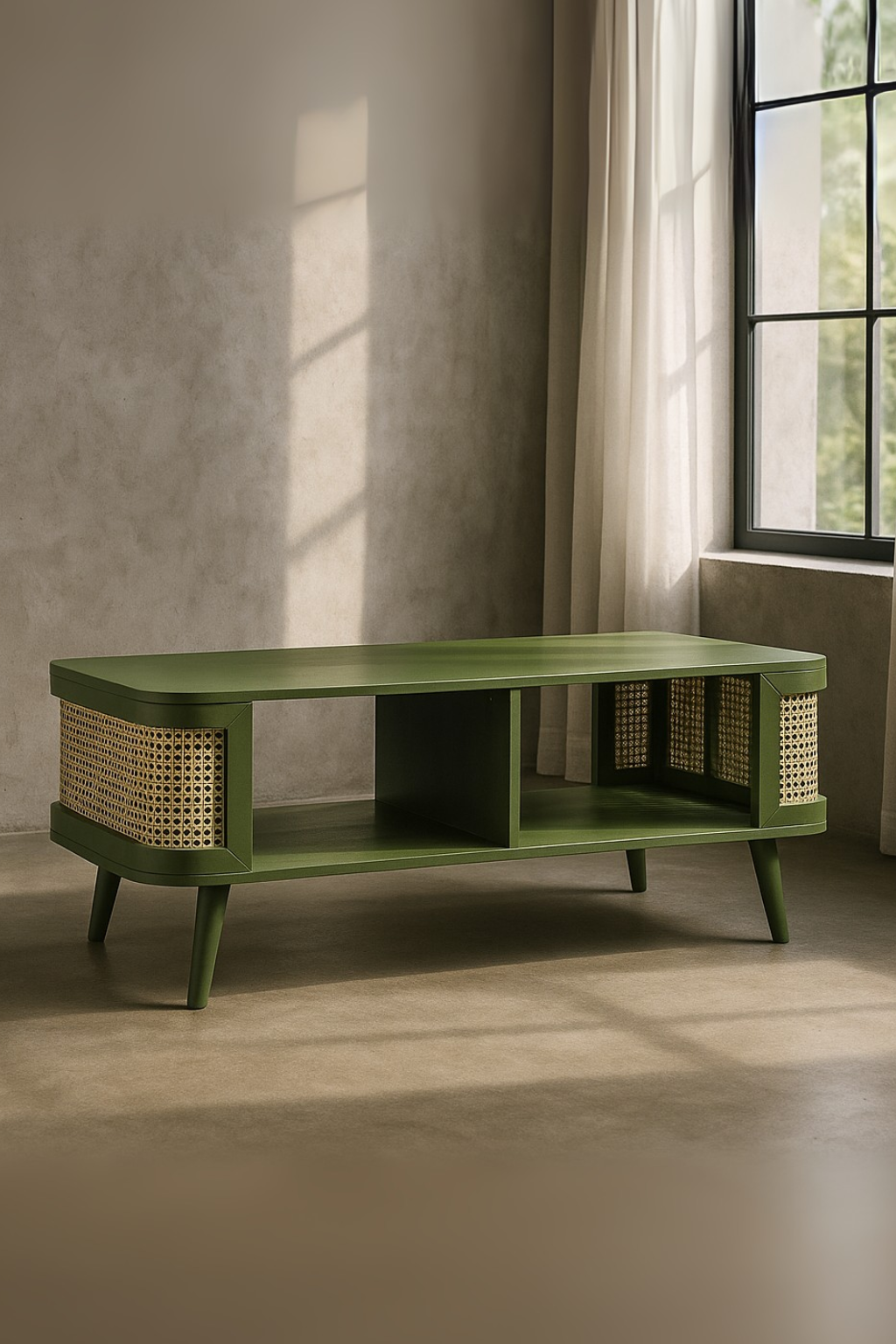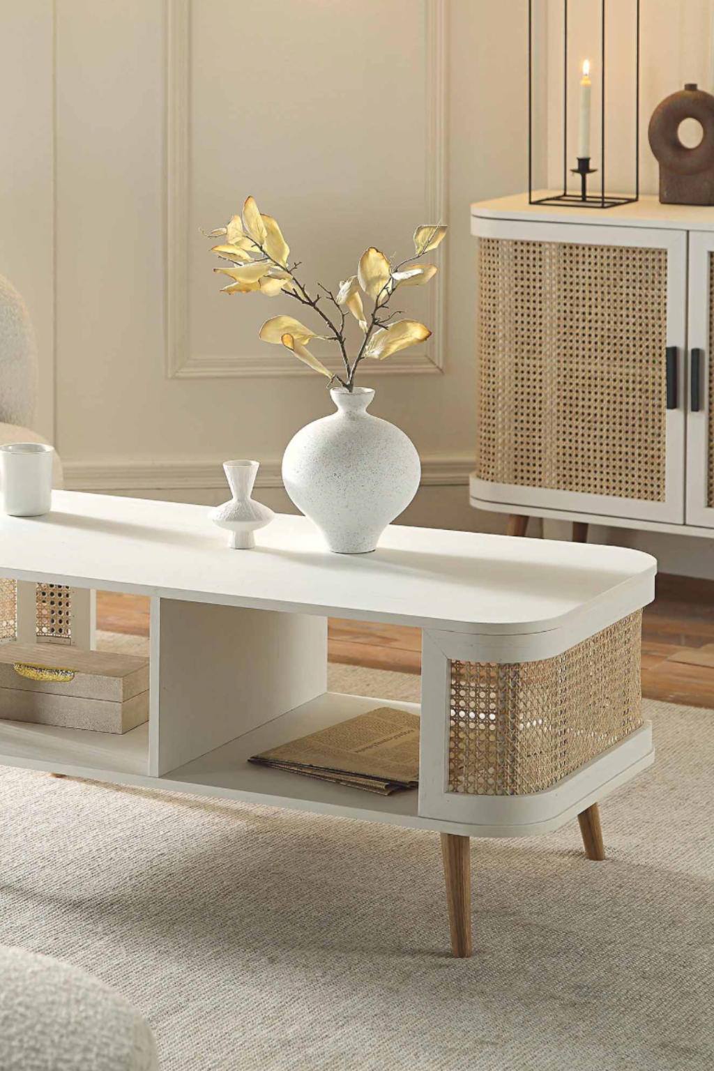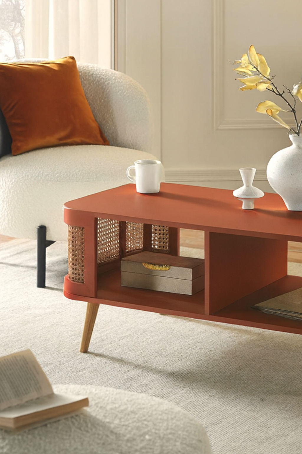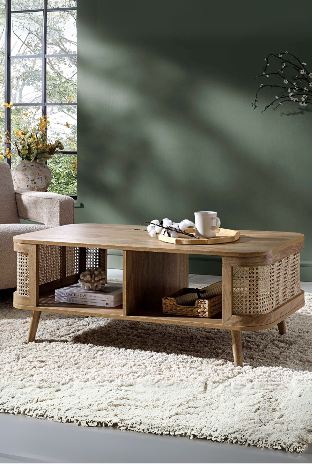 The Ranchi Coffee Table features a rectangular wooden frame complemented by elegant rattan insets, blending natural textures with sturdy craftsmanship. Supported by four tapered legs, its design ensures stability and a refined silhouette, making it an ideal centerpiece for contemporary living spaces seeking both functionality and style.