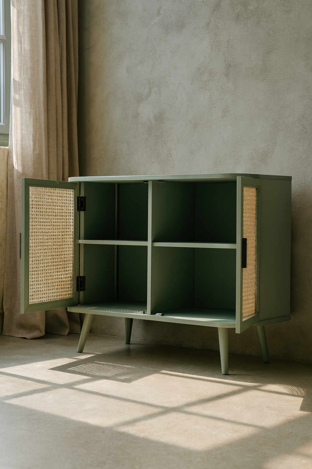 The Ranchi Small Sideboard offers a spacious design with three wide doors, providing ample storage for organized living spaces. Crafted from quality wood, it ensures durability and a refined finish. Equipped with reliable Hettich mechanisms, the sideboard guarantees smooth and long-lasting operation, making it a robust and functional addition to any room.