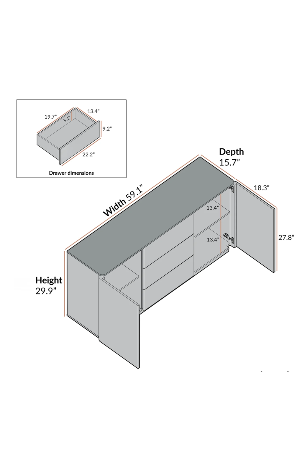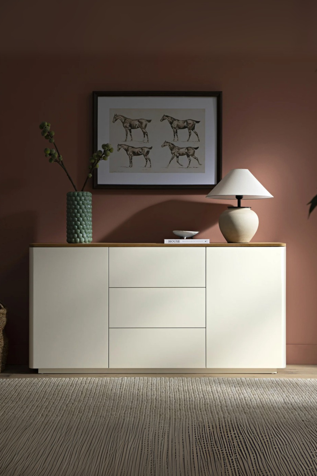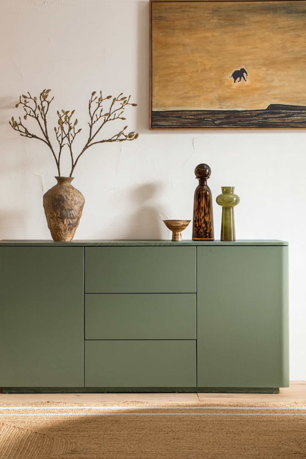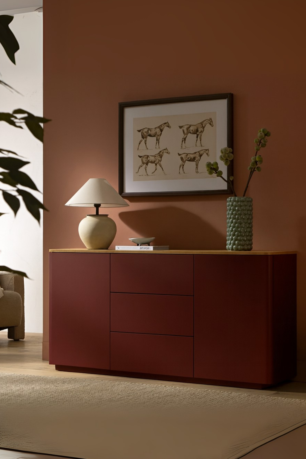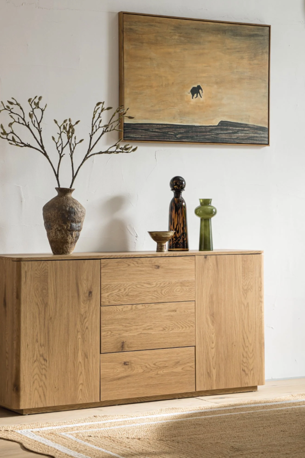 The Silchar Wide Sideboard features a stylish 3-section design with three spacious drawers, combining functionality with elegant curved wood detailing. Crafted for robustness and aesthetic appeal, it offers both durable construction and a sophisticated look, making it a practical centerpiece for any living or dining space.
