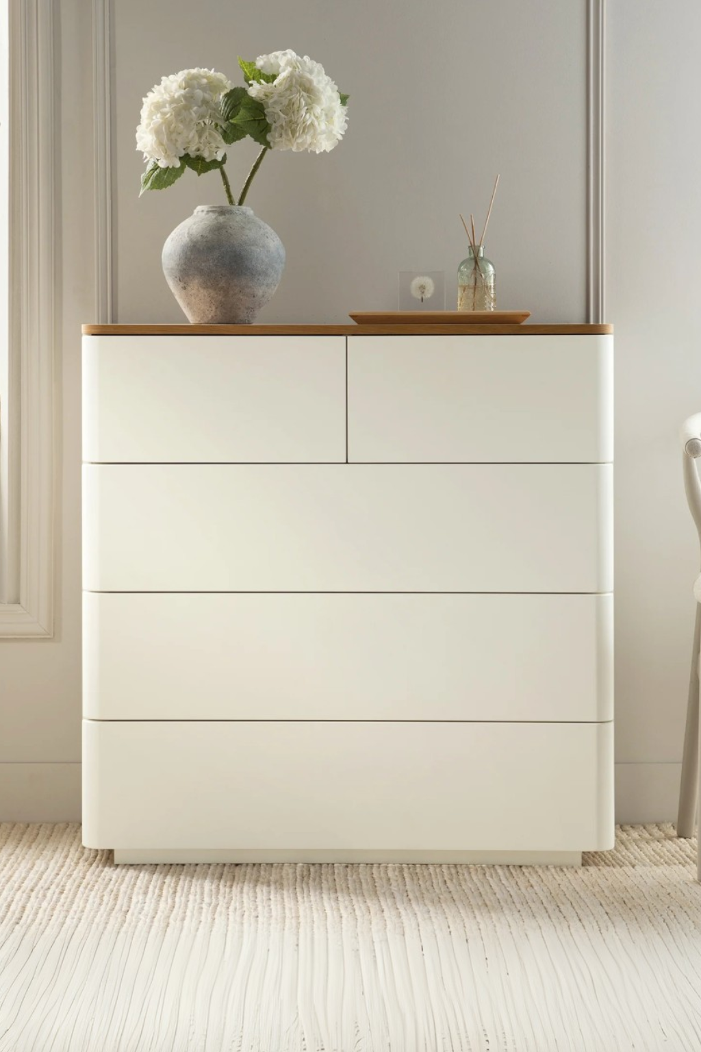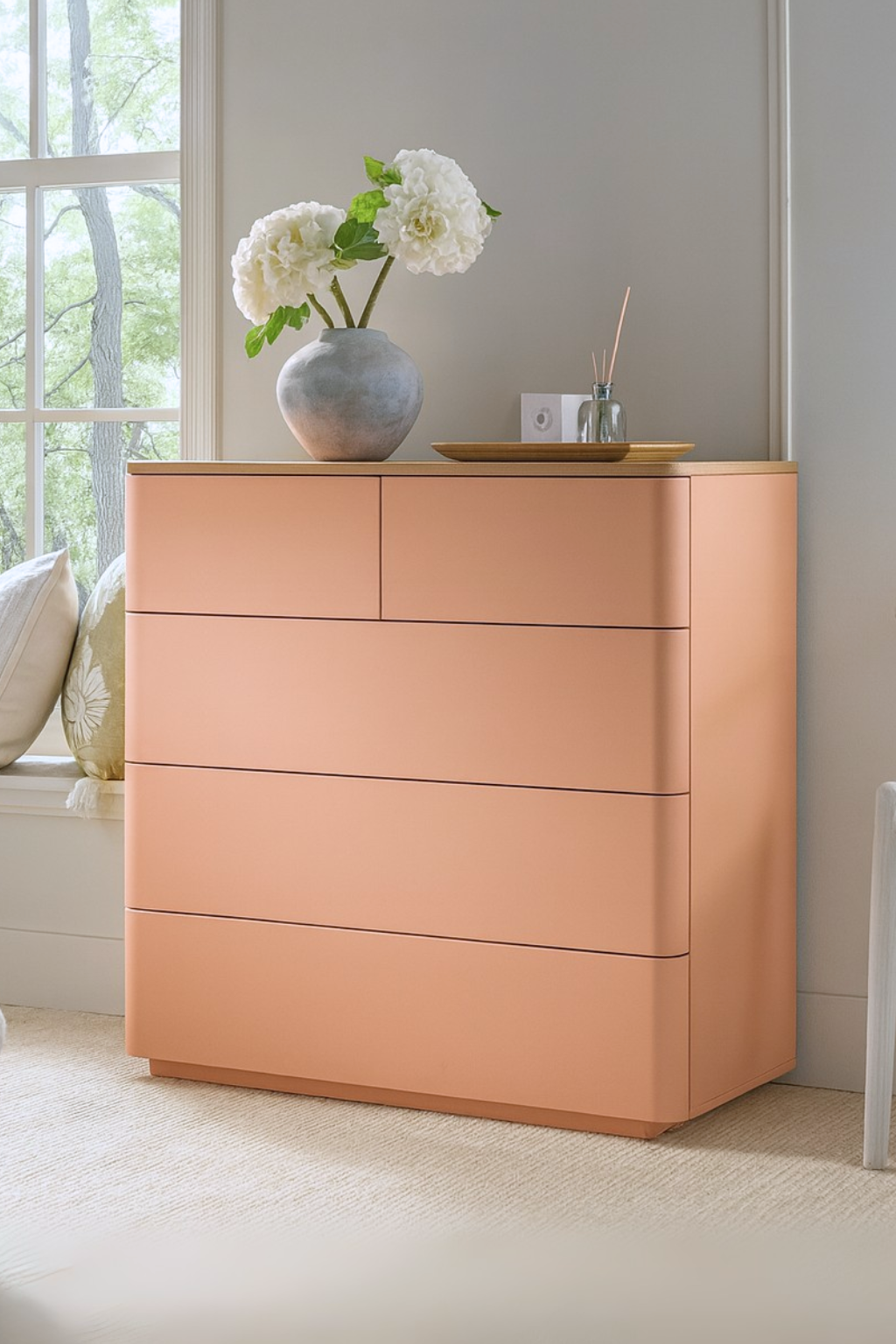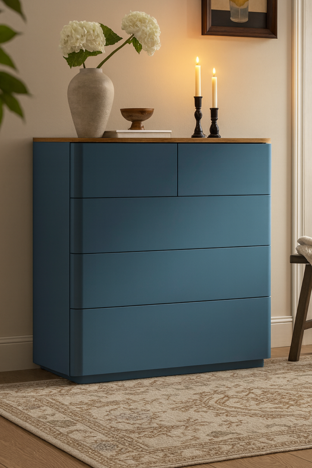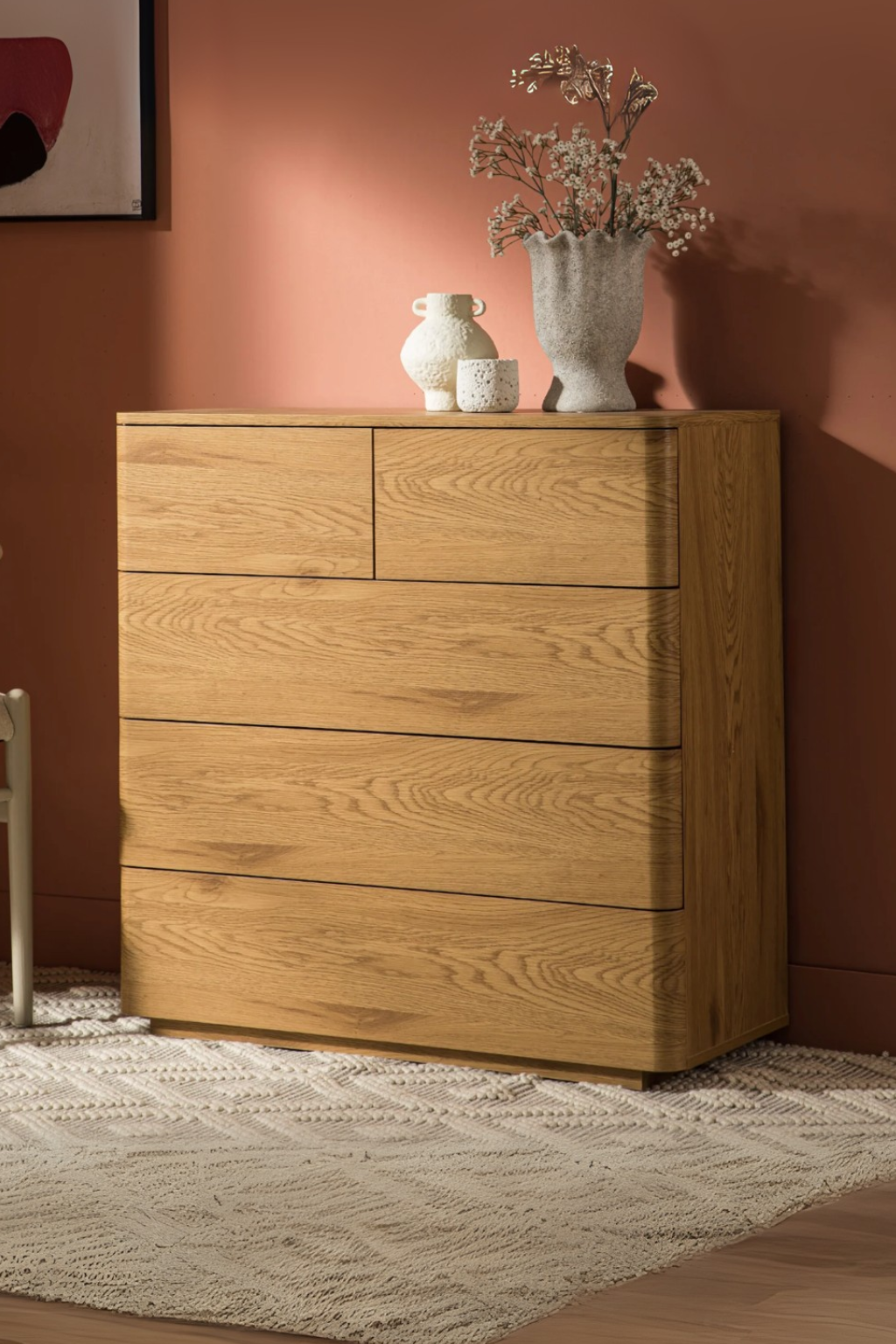 The Silchar 5 Drawer Chest features a smooth finish and a solid wooden countertop, providing both elegance and durability. Equipped with high-quality Hettich drawer mechanisms, it ensures effortless and reliable drawer operation. This expertly crafted chest offers practical storage with a refined look, making it a valuable addition to any space.